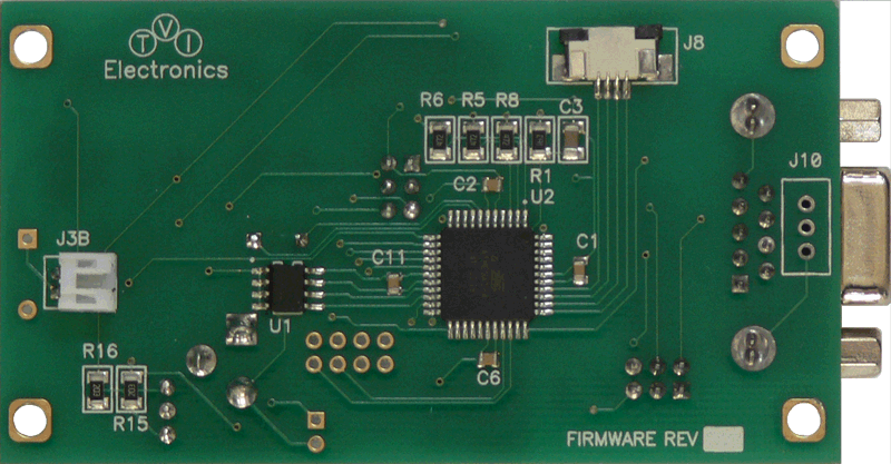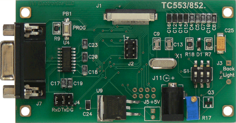 The TC553/852 is an intelligent 128x64 LCD controller with integrated touch screen control that provides the Graphical User Interface (GUI) for connecting Kyocera Display (former Optrex) F-51553 and F-51852 Series 128x64 COG Monochrome STN Graphic LCD displays with the target development board. This controller allows user to individually control each display pixel. This independent pixel control allows displaying both text and pictures simultaneously. The TC553/852 uses an ATMEGA16 microcontroller and external AT24C512 serial EEPROM. The controller can be used as a development board and reprogrammed via AVRISP device or OEM. This board requires a single 5 VDC supply to be plugged into J5 connector (bypass voltage regulator) or 7-15 VDC power supply to be plugged into J11 connector.